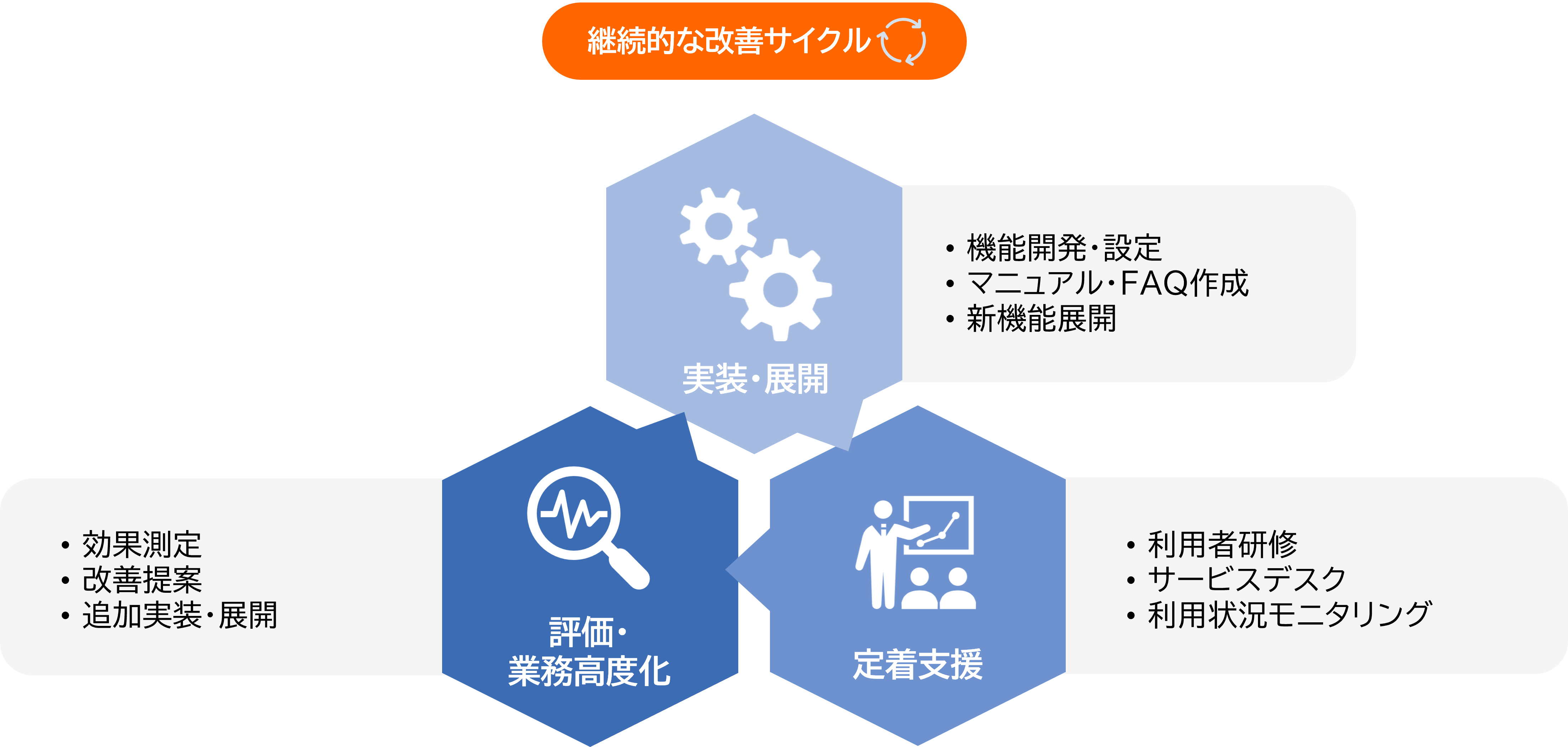 また、運用定着後も継続的な改善提案を行い、あるべき姿を実現できるまで伴走支援を実施いたします。